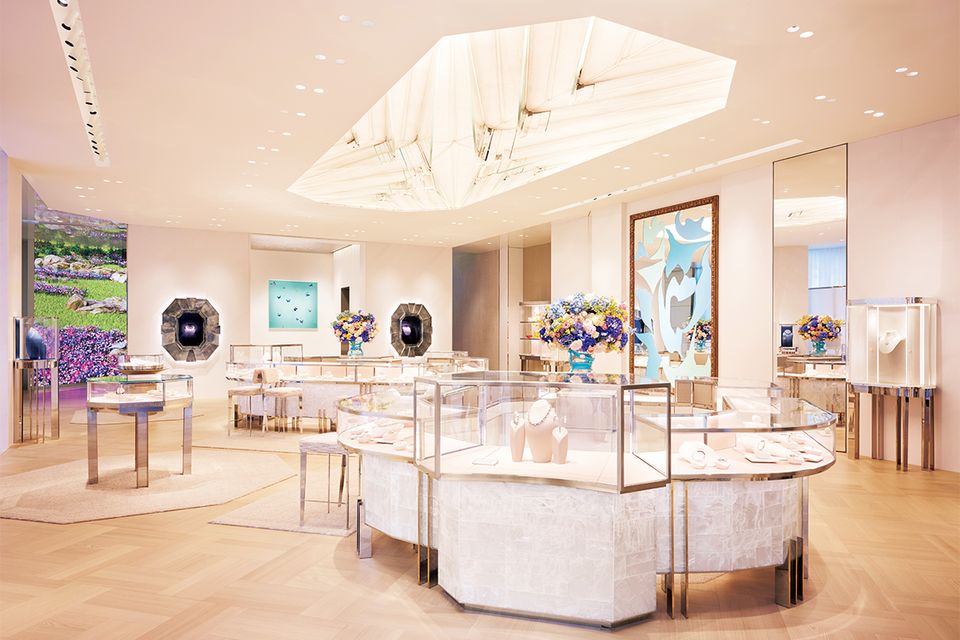 眩いばかりのティファニー ブルーの波が打つ華やかな外観、全5フロアのいずれもアートとジュエリーを融合したハイセンスなしつらいで、来訪者を魅了します。