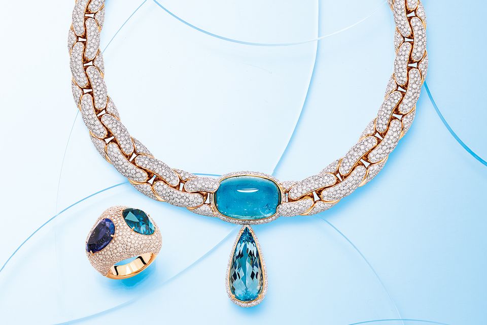 カボションカットとファセット入りのティアドロップ。対照的な2つのアクアマリンが存在感を放つ。「アクアマリンドリーム」ネックレス(RG×アクアマリン計53.93ct×ダイヤモンド25.38ct)6789万2000円 「デュエット」リング(RG×タンザナイト8.45ct×ジルコン18.28ct×ダイヤモンド4.33ct)1623万6000円/ともにポメラート