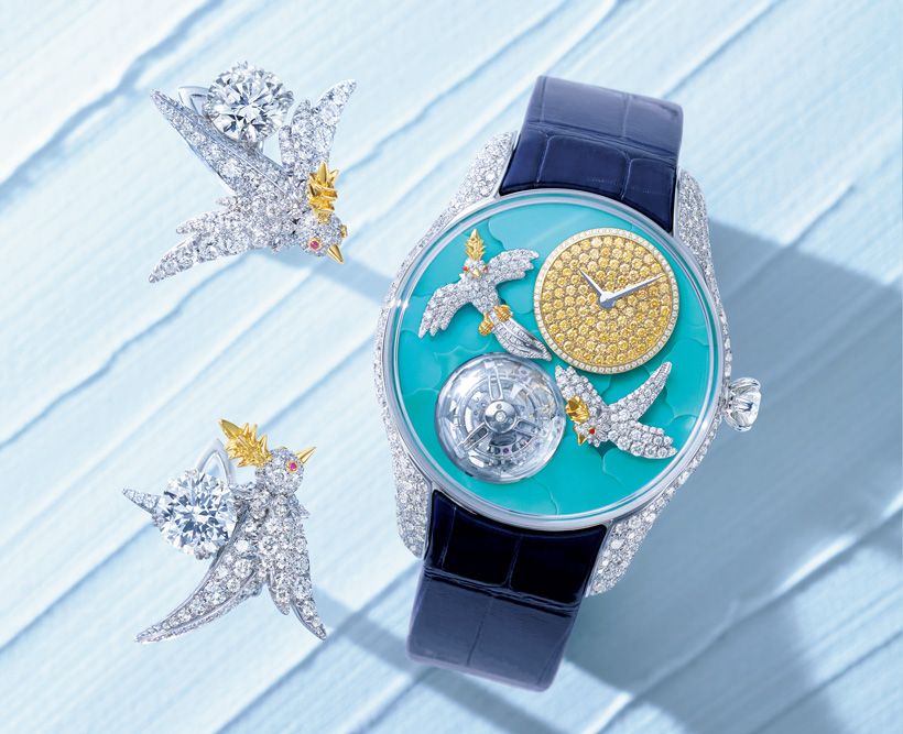 20世紀で最も称賛されたジュエリー デザインの一つ「バード オン ア ロック」が時を経てさらに進化。天然ターコイズの象嵌を施した文字盤の空で2羽のバードが羽ばたく。1時位置の時分ダイヤルにはイエローダイヤモンドを敷き詰めて。