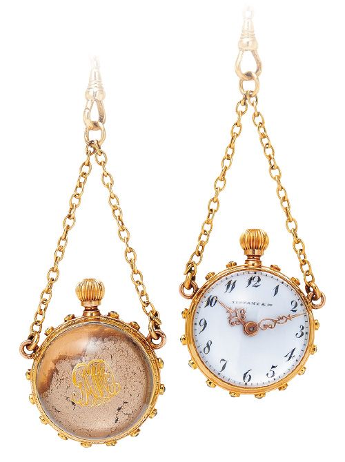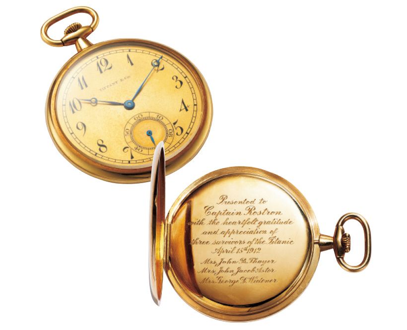 タイタニック号の事故の生存者である3名の女性が、救助に尽力したカルパチア号の船長に贈ったティファニー製の懐中時計。2024年、英国で開催されたオークションで同社がタイタニック号の遺品として過去最高額で落札。