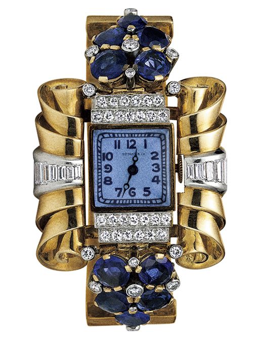 1939〜40年にニューヨーク州クイーンズで開催された万国博覧会に出品したジュエリーウォッチ。彫刻的なフォルムにジェムストーンとさまざまなカットのダイヤモンドをあしらい、風防にはサファイアを採用。