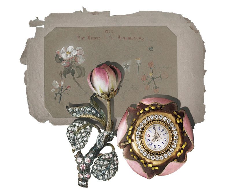 パリ万国博覧会でティファニーは数々のメダルを獲得し、その名を世界に広める。写真はハイジュエリーと時計製作の技術を融合し、同年に製作された「アップル ブロッサム ラペルウォッチ」。