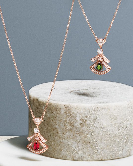 右から「ディーヴァ ドリーム 」ネックレス(PG×グリーントルマリン×ダイヤモンド)140万8000円 同(PG×ルベライト×ダイヤモンド)140万8000円/ともにブルガリ(ブルガリ・ジャパン フリーダイヤル 0120-030-142)