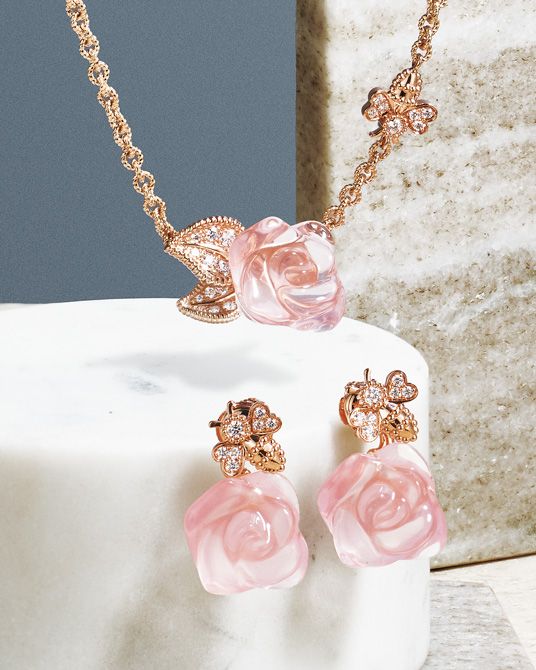「ローズ ディオール プレ カトラン」ネックレス(PG×ダイヤモンド×ピンククォーツ)250万円 同イヤリング(PG×ダイヤモンド×ピンククォーツ)270万円/ともにディオール ファイン ジュエリー(クリスチャン ディオール フリーダイヤル 0120-02-1947)