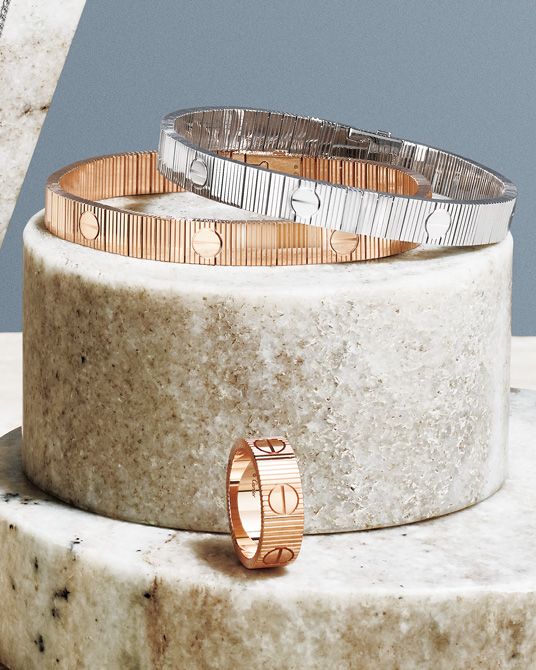 上から「LOVE アンリミテッド」ブレスレット(WG)159万7200円 同(PG)149万1600円 同リング(PG)42万9000円/すべてカルティエ(カルティエ カスタマー サービスセンター フリーダイヤル 0120-1847-00)