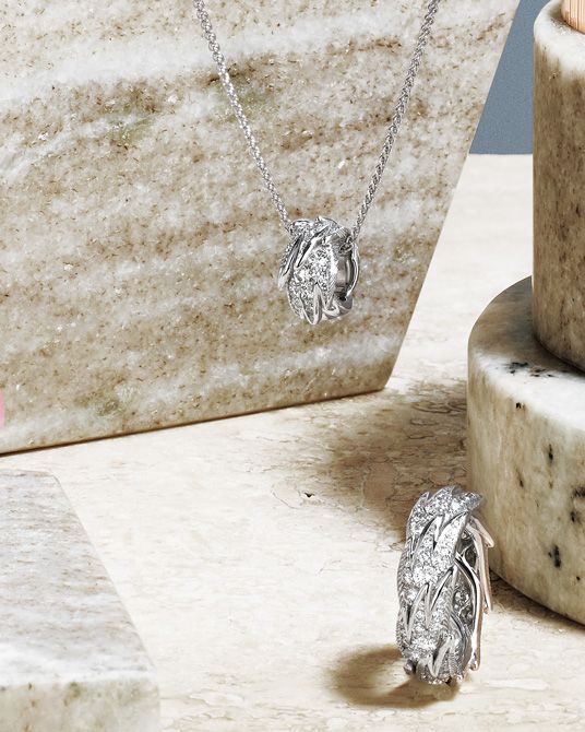 Tiffany & Co.(ティファニー)自然界をモチーフにしたジュエリーでティファニーの歴史に名を刻んだジャン・シュランバージェ。愛を謳い、空を舞う鳥の羽根を連ねたリングとペンダントは、彼の「バード オン ア ロック」ブローチから着想を得たもの。ハイジュエリーの技法により、繊細な羽根のラインが見事に描き出されています。