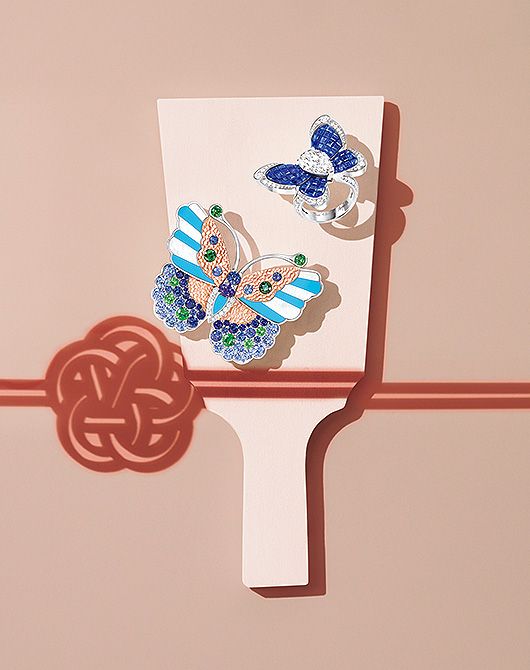 明るい未来へと誘う自由な蝶の羽ばたき「ヴァン クリーフ&アーペル」の歴史において、常に創造の源として愛されてきた蝶。その麗しき姿を彩るのは、色鮮やかなカラーストーンです。伝統のミステリーセット技法がなめらかな光沢で気品を漂わせ、そして豊かなカラーパレットが夢の世界を紡ぎます。愛らしく舞うモチーフが、未来への希望を伝えて。