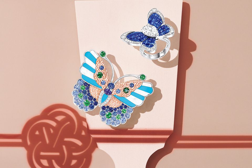上・「カリマ パピヨン リング」(WG×RG×サファイア計6.01ct×ダイヤモンド計4.30ct)〈参考商品〉 下・「オロブ パピヨン クリップ」(WG×RG×サファイア計8.69ct×ツァボライト計2.19ct×ターコイズ×マザーオブパール×ダイヤモンド計0.20ct)〈参考商品〉/ともにヴァン クリーフ&アーペル(ヴァン クリーフ&アーペル ル デスク)