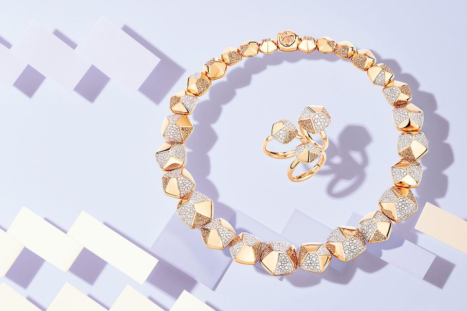 現代的な洗練の中に宿る 輝かしき未来への予感ジオメトリー(幾何学)をテーマとする、構築的なフォルムが印象的な「ペンタゴニ」。さまざまな角度で構成した大小異なる鏡面仕上げのゴールドと繊細なダイヤモンドの輝きが、目覚ましい美しさを奏でます。見事な職人技を投影した幾何学模様は、五角形が連なるデザイン。実は5は調和を意味し、縁起がよいとされている数字。艶やかに磨かれたローズゴールドに、そんな幸せへの願いをも重ねてみてはいかがでしょう。
