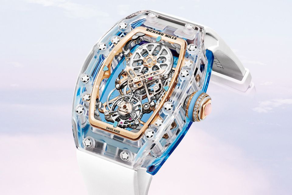 重さ数十キロのブロックから24時間体制で40日間の研削をし、加工時間も1000時間以上と手間をかけて完成するサファイアのケースは唯一無二の美しさ。リューズをぐるりと囲むダイヤモンドも、さらなる高級感を添えて。この記事の掲載号
