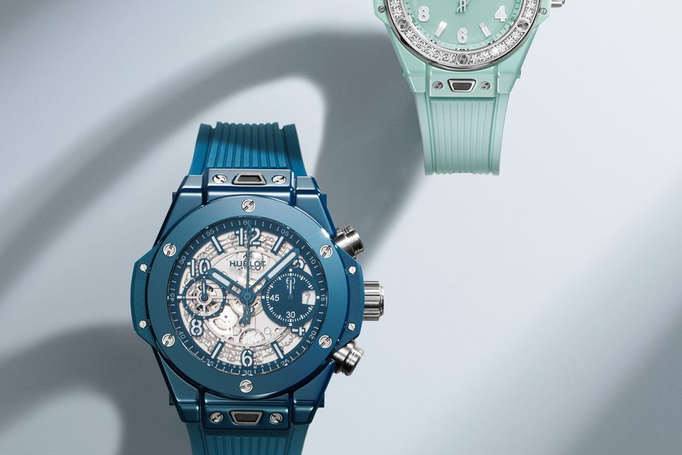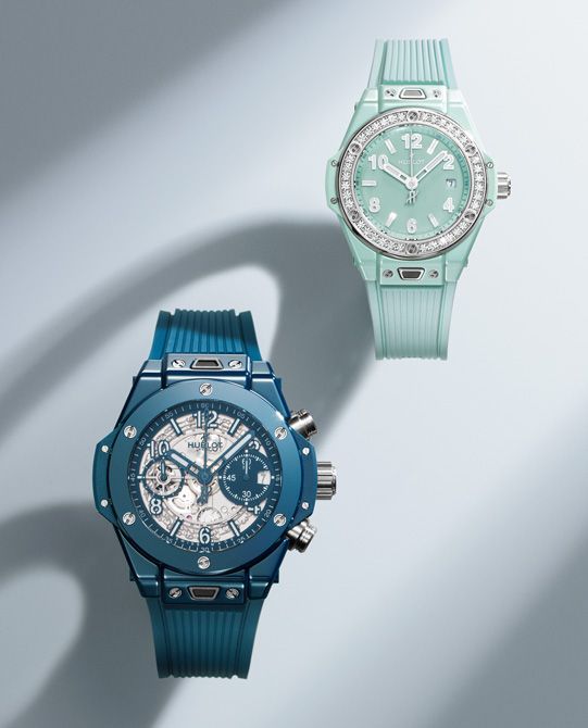 左・時計のケースだけではなく、ダイアルや針、そしてスポーティなライン入りのストラップに至るまで、落ち着きのある質感のブルーで統一。「ビッグ・バン ウニコ ペトロールブルーセラミック」(ペトロールブルーセラミック、ラバーストラップ、ケース径42ミリ、自動巻き)331万1000円 右・ケースの上下に取り付けられた台形のボタンを押せば、ストラップを簡単に交換することが可能。「ビッグ・バン ワンクリック ミントグリーンセラミック ダイヤモンド」(ミントグリーンセラミック×ダイヤモンド、ラバーストラップ、ケース径33ミリ、自動巻き)239万8000円(LVMHウォッチ・ジュエリージャパン ウブロ 電話 03-5635-7055 URL:https://www.hublot.com/)
