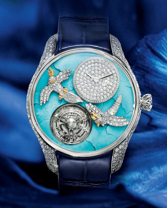ファセット加工を施した薄いサファイアクリスタルの下に、機構が浮いて見えるフライング トゥールビヨンを配置。ダイヤモンドでかたどった2羽のバードが、トゥールビヨンの周りで優雅に戯れます。ターコイズの象嵌細工の上に配した時分針を示すサブダイヤルとのアシンメトリーなレイアウトも、実にモダンな美しさ。