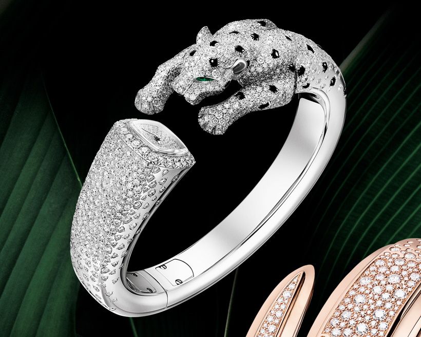 パンテールが文字盤に戯れ、とびかかるような生命力溢れる躍動感に、メゾンの巧みなサヴォアフェールが覗きます。