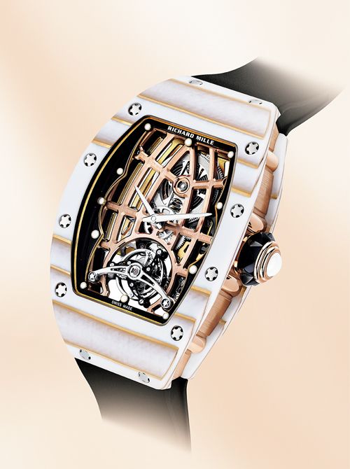 光り輝く素材で極まる複雑機構の美しさリシャール・ミルが誇るスケルトン構造のモデル。透かし彫りの構造の中にトゥールビヨンのダイナミックな動きが目を奪います。クオーツファイバーの層に22Kレッドゴールドを埋め込んだ、新素材のゴールドクオーツTPT®がその美しさをさらに際立てています。