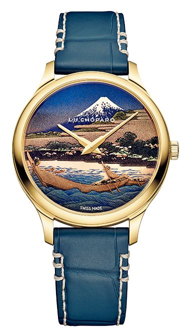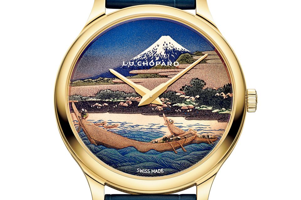 北斎の描いた浮世絵が清雅によみがえり時を刻む日本にインスパイアされたスペシャルな限定コレクションより、葛飾北斎にオマージュを捧げ「冨嶽三十六景」の『東海道江尻田子の浦略図』を蒔絵で描いたウォッチ。漆器の名店、山田平安堂の熟練蒔絵師である小泉三教氏とのコラボレーションから生まれた名品です。舟、松原、雪をかぶった富士からなる風景が、絶妙な構図で文字盤上に再現されています。時計「L.U.CXP 漆 浮世絵」(YG、アリゲーターストラップ、ケース径40ミリ、自動巻き、世界限定8本)594万円/ショパール(ショパール ジャパン プレス)